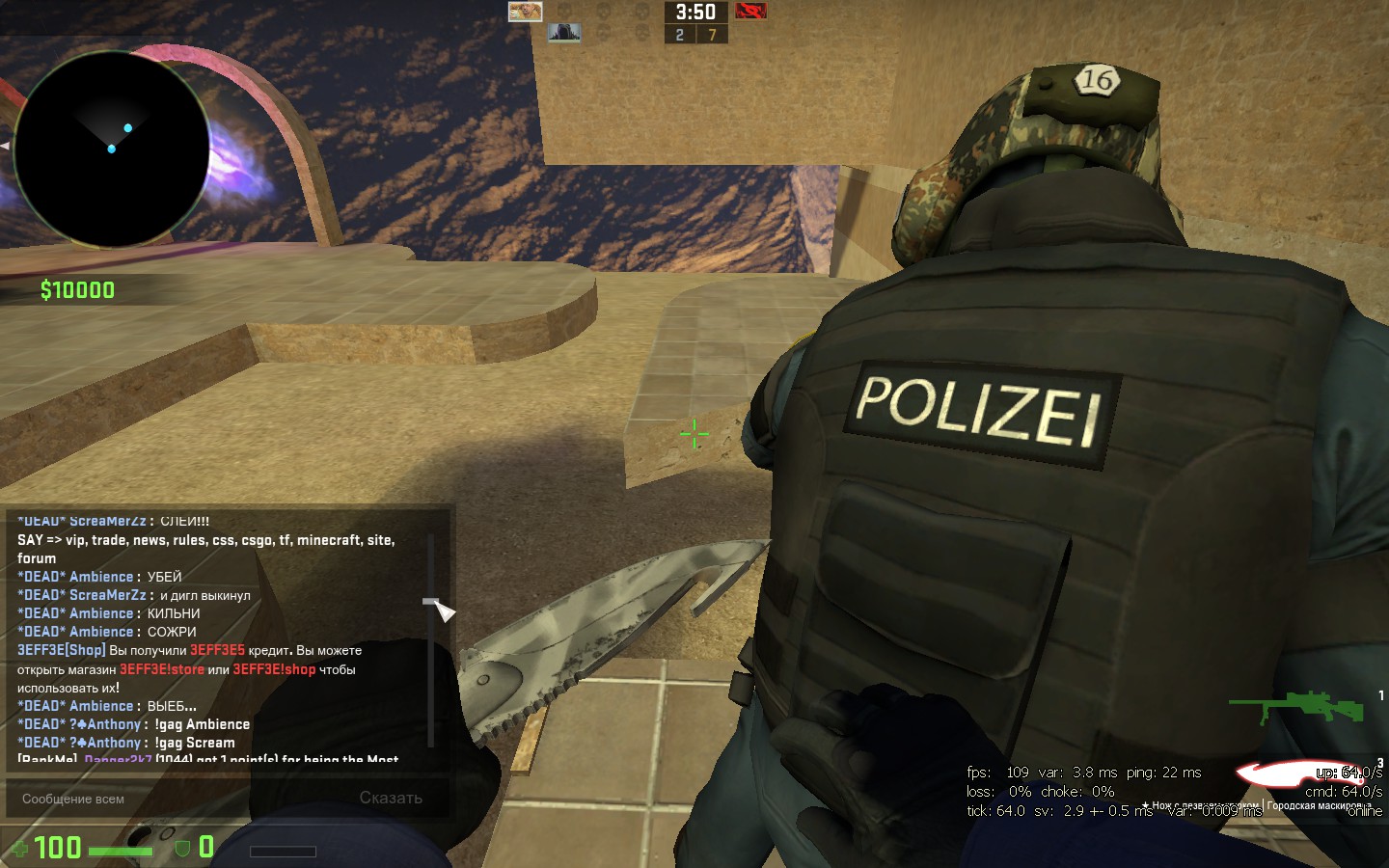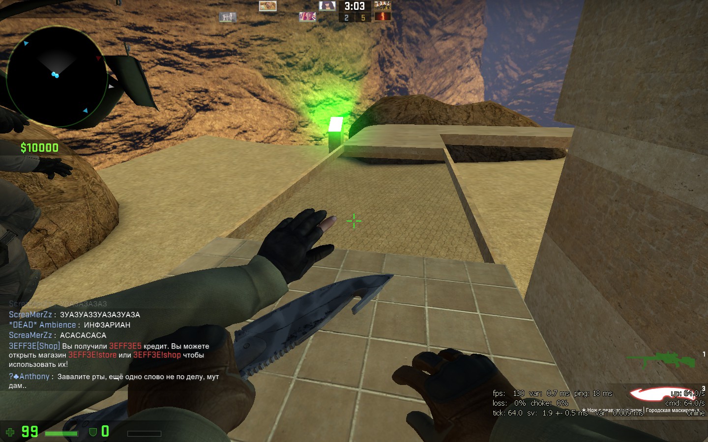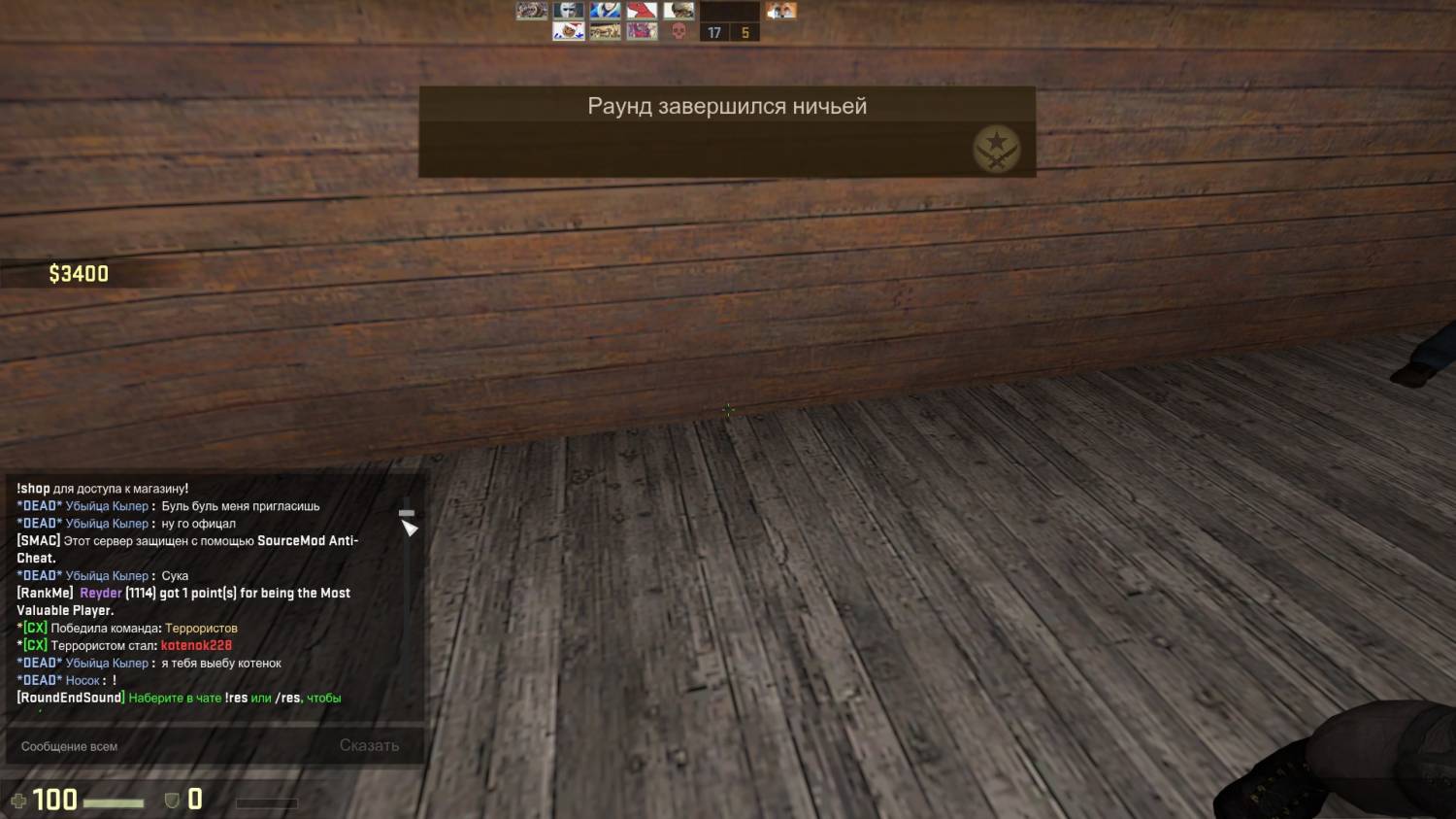 1)Ваш никнейм в игре: ScreaMerZz 2)Кто вас обидел: Anthony а)Статус игрока(читер/обычный игрок/администрация/я не знаю): Админ б)Его никнейм: Anthony в)Его Стим: г)Его STEAM ID: 3)Чем вас он обидел(читы/оскорбления/нарушение правил сервера/несправедливое наказание/реклама стороннего проекта/прочее(написать кратко и понятно)) Я написал 4 сообщения по делу.Тер выкинул авп и дигл за карту.+ Соул оф найт матерился написал 2 раза "сука",а Энтони никак не отреагировал. Скрин мата только 1,т.к чат выше удалился в кс :с Думаю,говорить игрокам "заткните рты" не самая лучшая затея... 4)Доказательства(демо/скриншоты/свидетели/прочее(предоставить в архиве и выложить ссылку на него)).