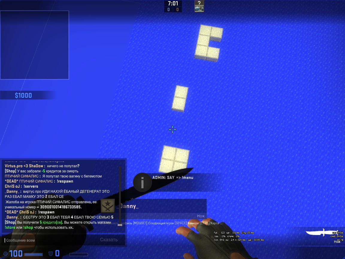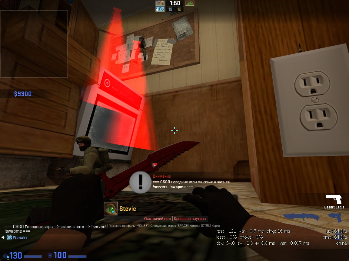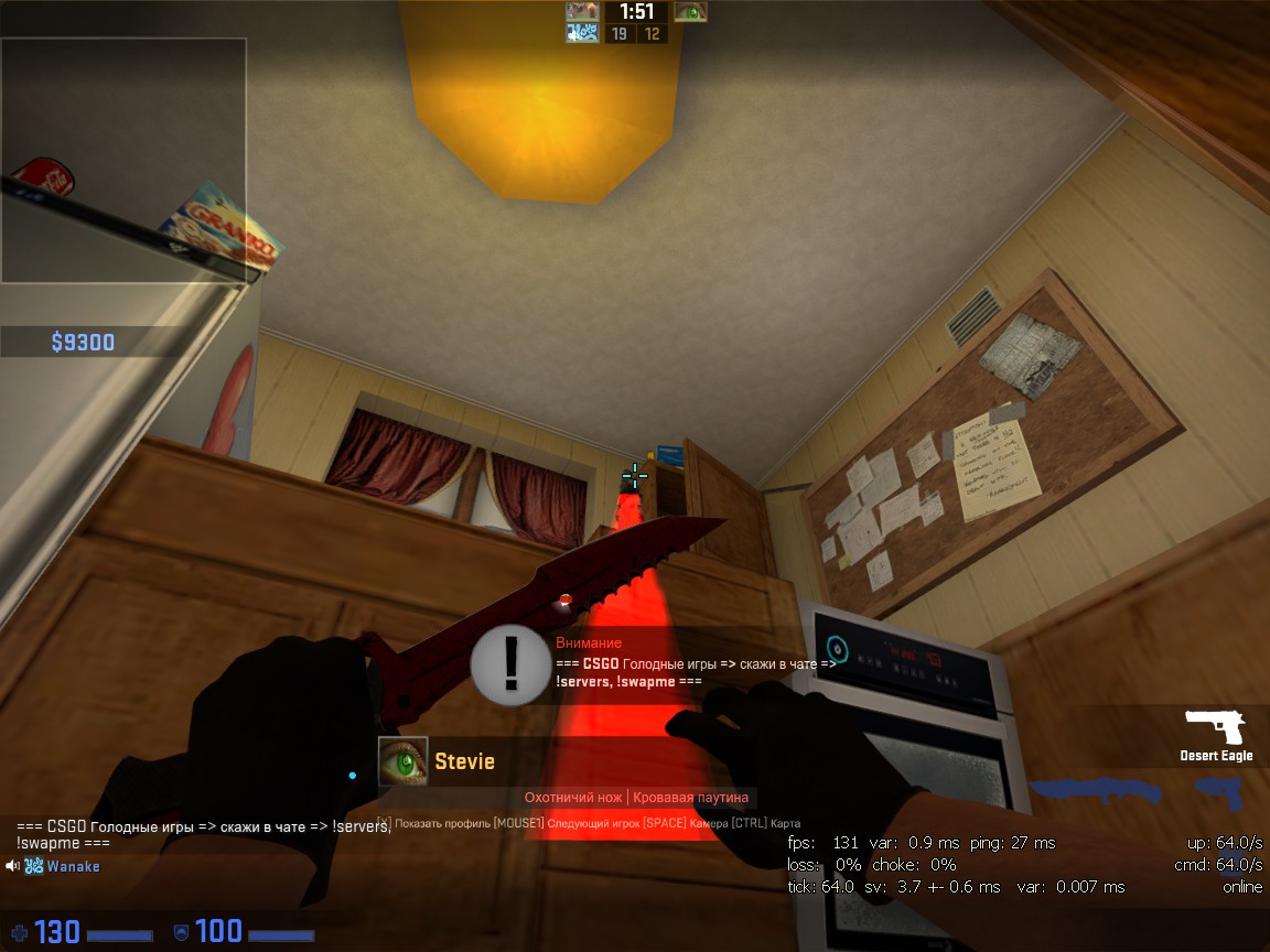 | Цитата Stevie (  ) ShaDow9303, ахаха, смотри сколько людей на сервере)) Если ты не заметил, то мы играли в рулетку, а паутинкой я спускал товарища своего на ковер =) Запрещено использовать HOOK-права на картах-прохождениях, где есть обе команды. (T и CT)