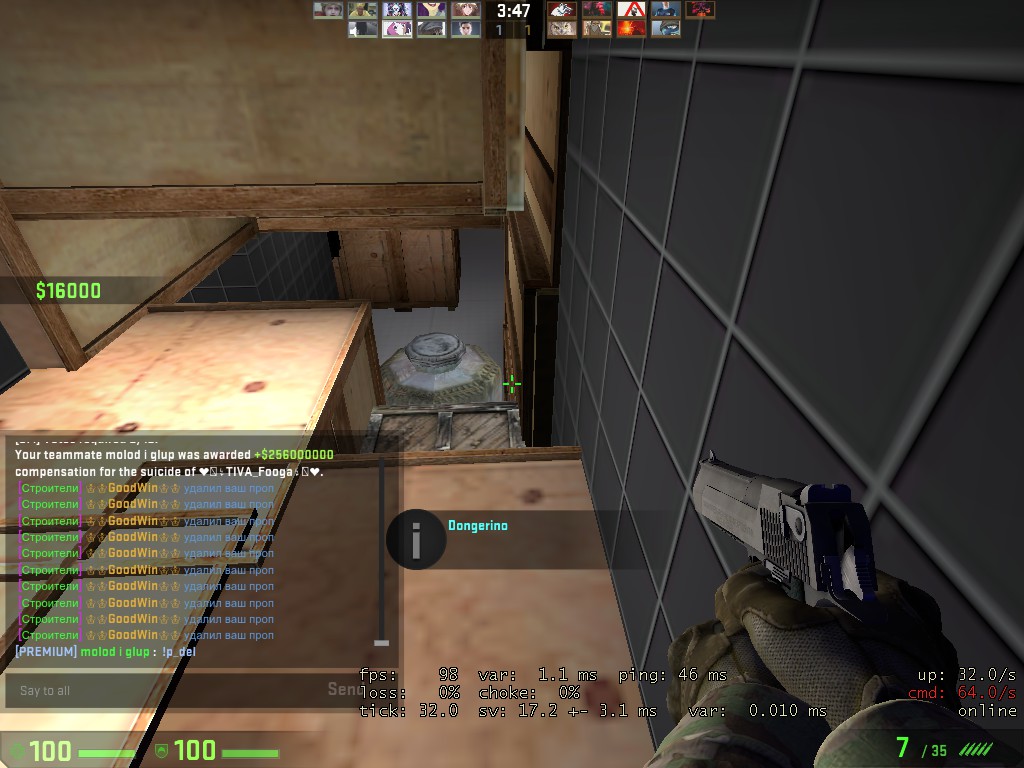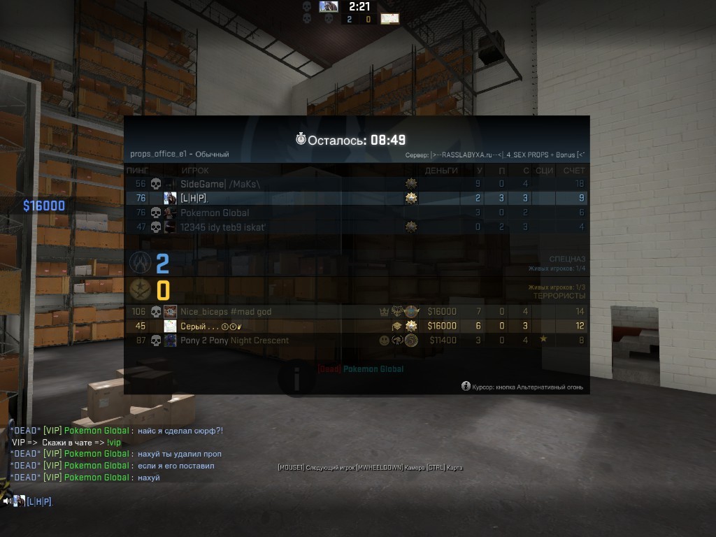 | 1)а)NICKNAME игрока: ♔♔GoodWin♔♔ б)NICKNAME игрока: Screameister 2)а)STEAM:ID игрока: STEAM_0:0:91567428 б)STEAM:ID игрока: STEAM_0:0:181643568 3) Дата (ДД.ММ.ГГ) и время (ЧЧ:ММ) провинности: 18:55 msc 4) Как согрешил игрок: удаление чужих пропов & застраивание респы террористов 5) Демка, скрин (прочая доказательная база только приветствуется): демка