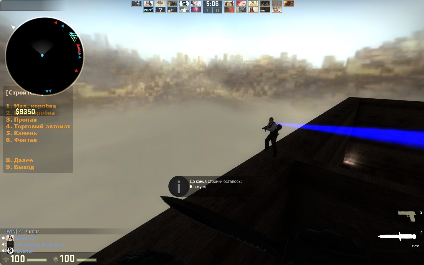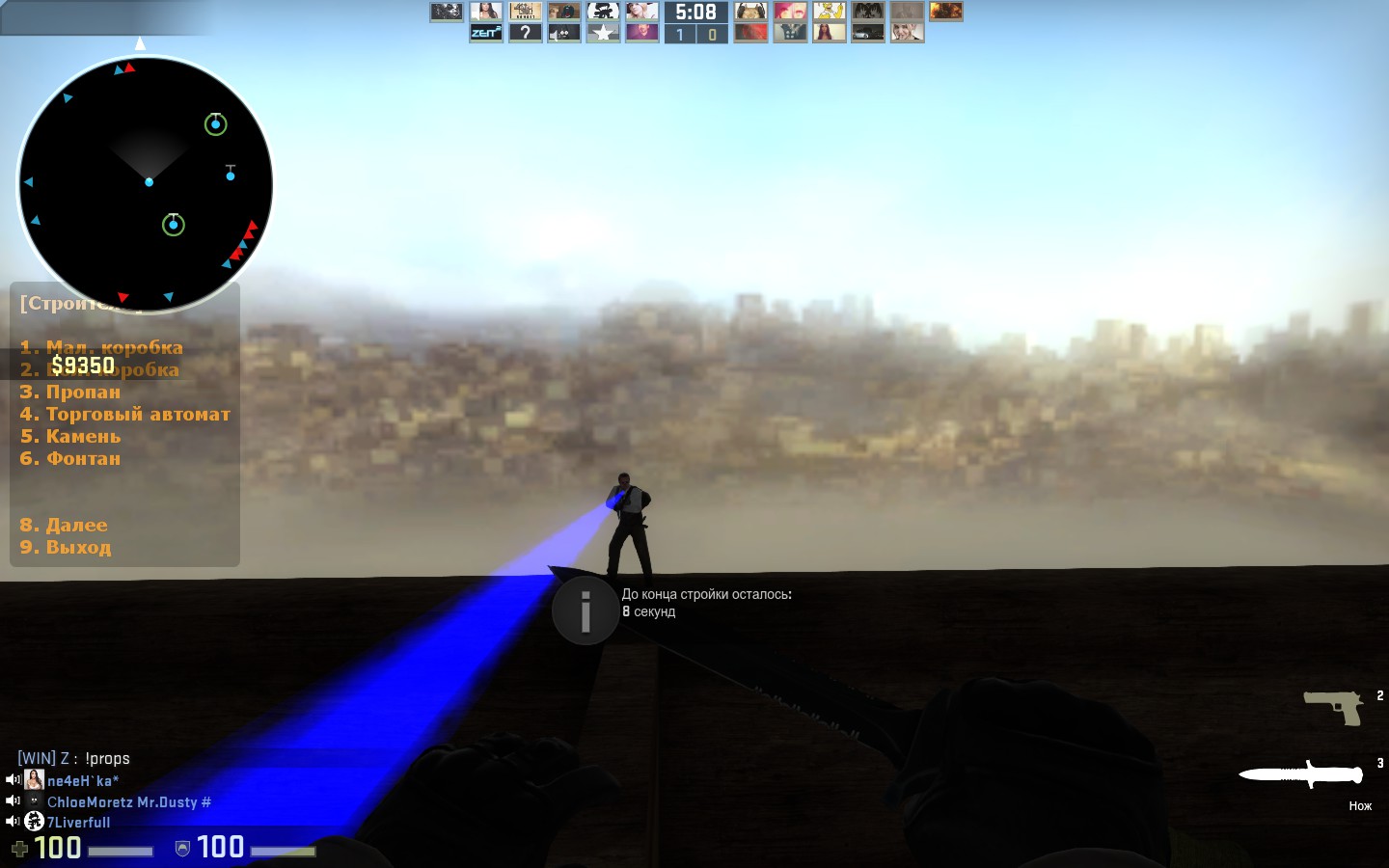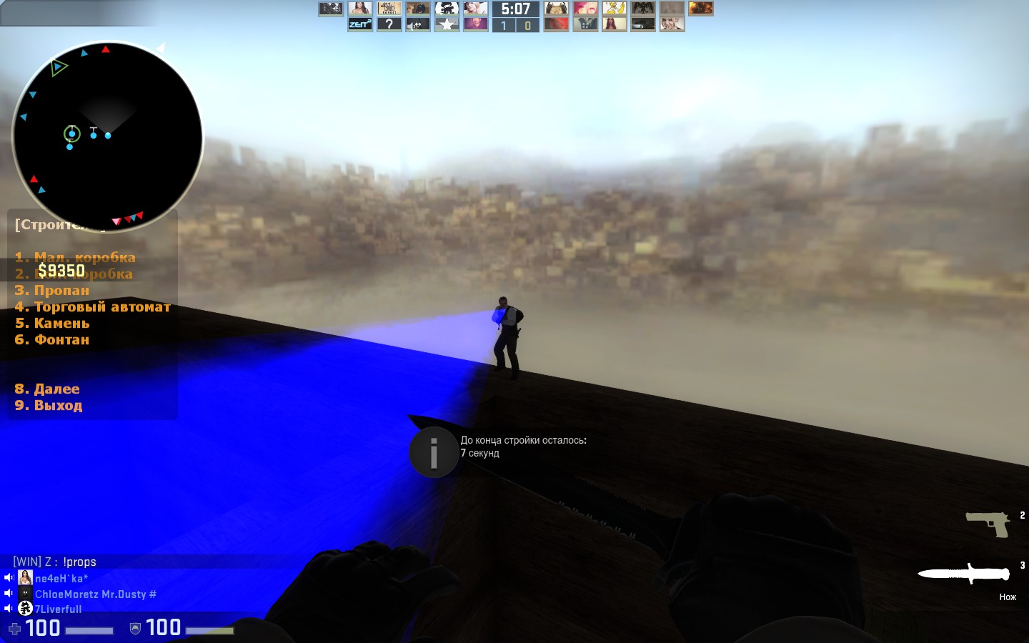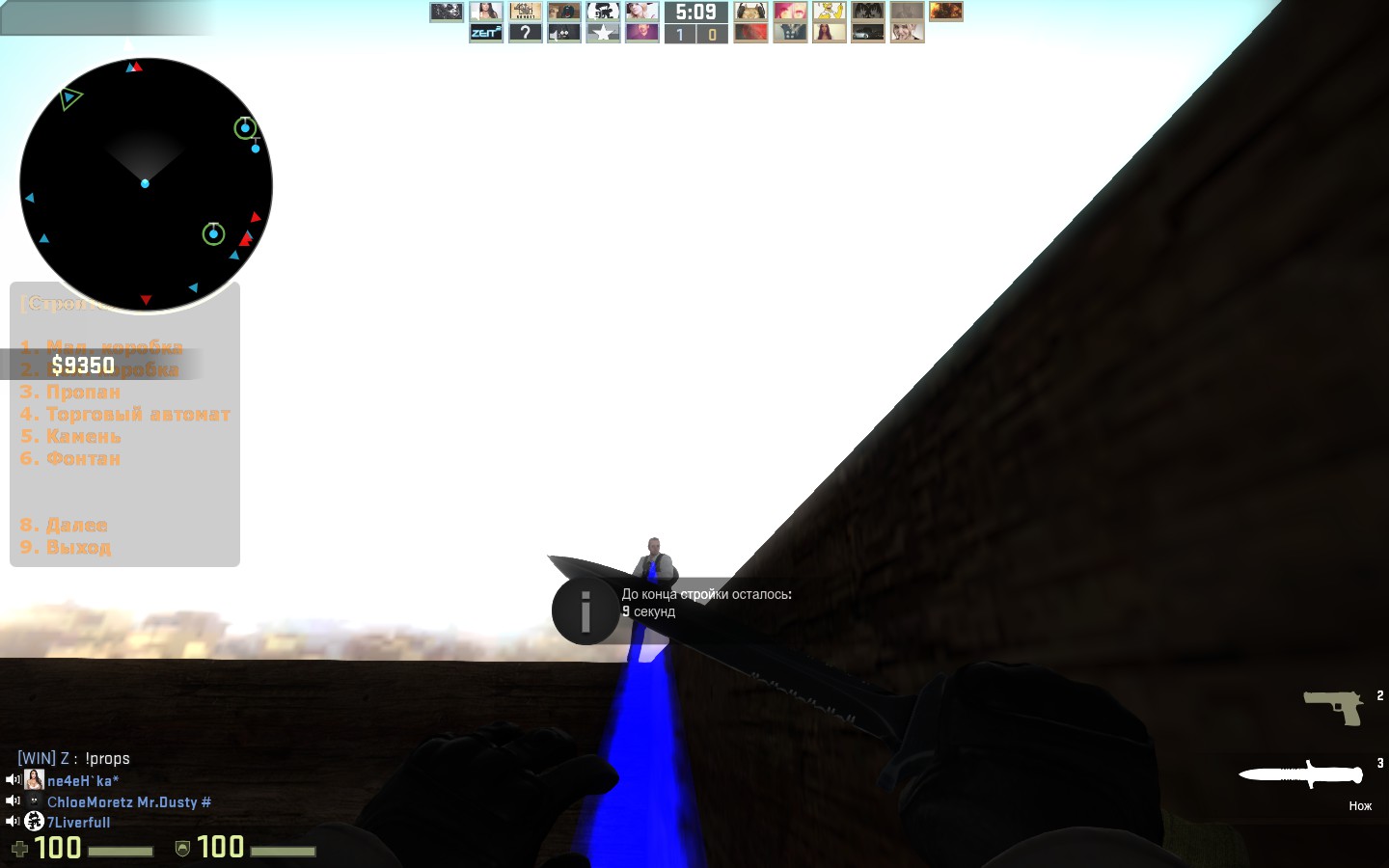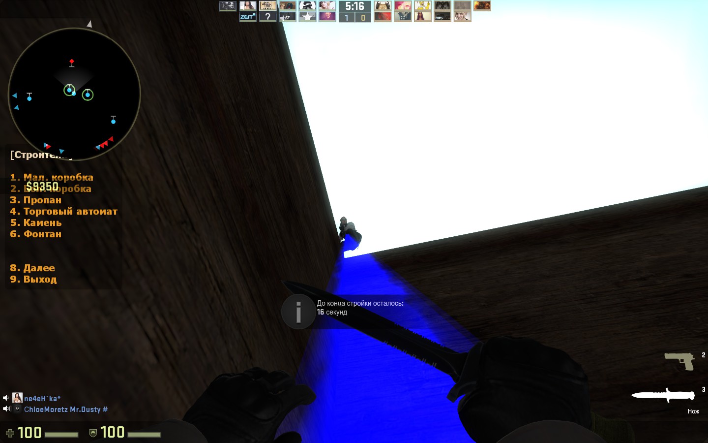 | 1) Binni_Pyx2) Стим айди не успел узнать, знаю только ссылку профиля: http://steamcommunity.com/profiles/76561198114108263/ 3) 22.06.14, а со временем ~15:25 4) Как согрешил игрок: В общем, он застроил респавнт Террористов. Потом, после окончания времени строительства, он начал шмалять по тем, кто стоял внутри спавна и многих убил. Так же у него не было прохода вы нычку. Я особо не хотел сюдя писать, но т.к. он убил много людей таким способом, накатайте ему бан, ну или предупреждение. 5) Демка, скрин (прочая доказательная база только приветствуется):http://rghost.ru/56514724, http://rghost.ru/56514739