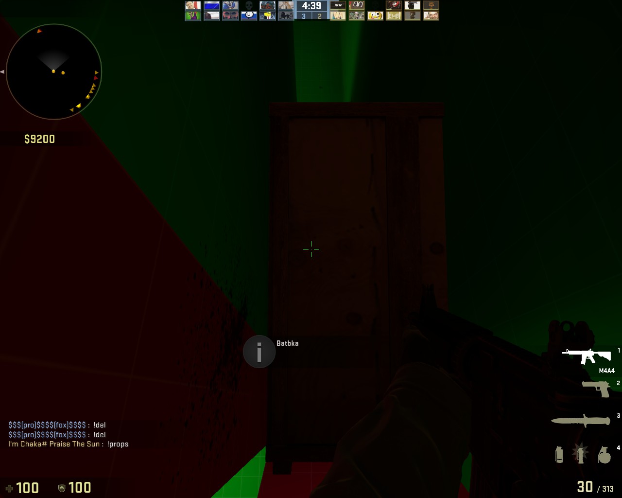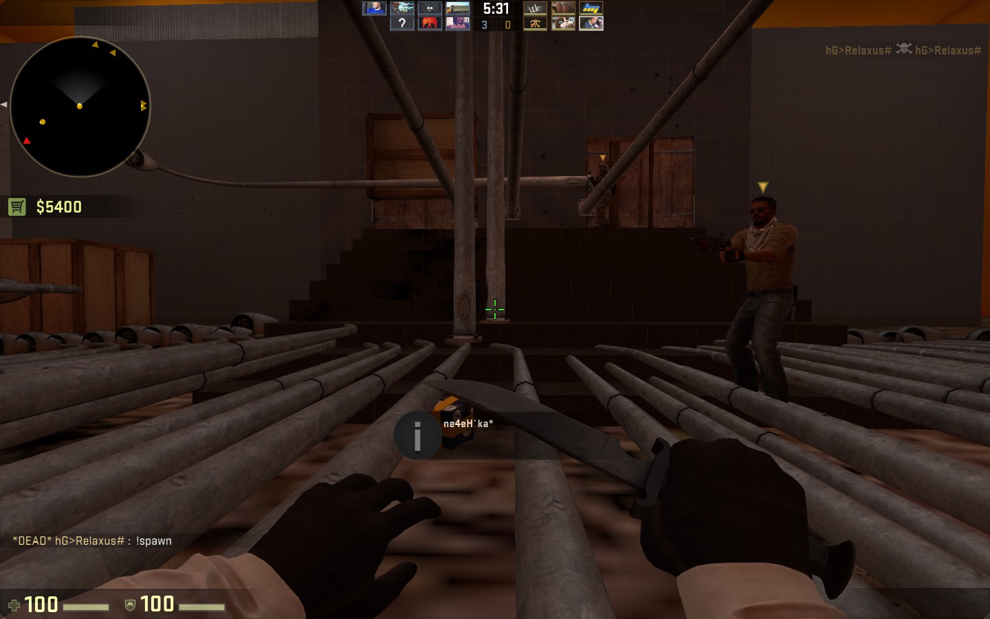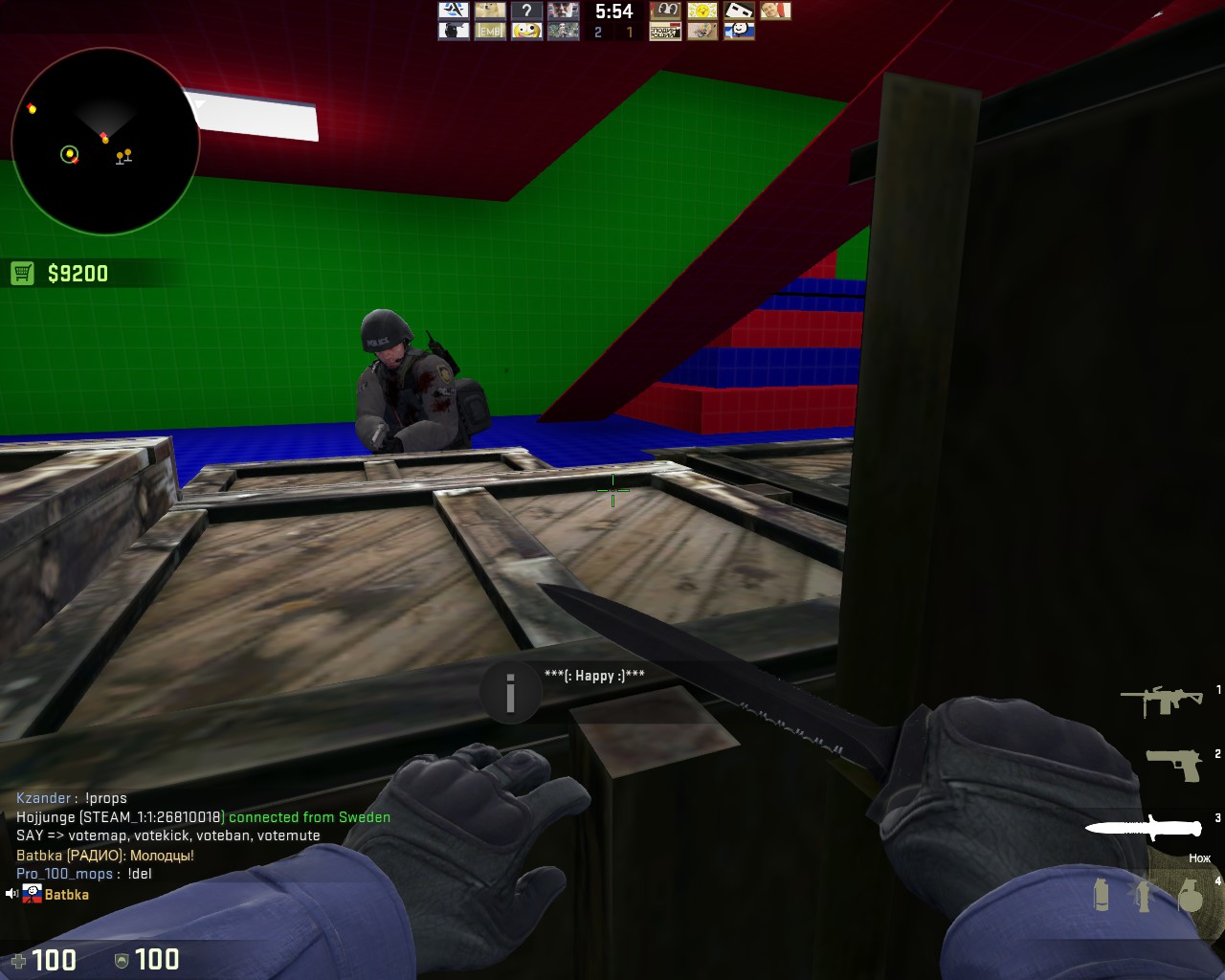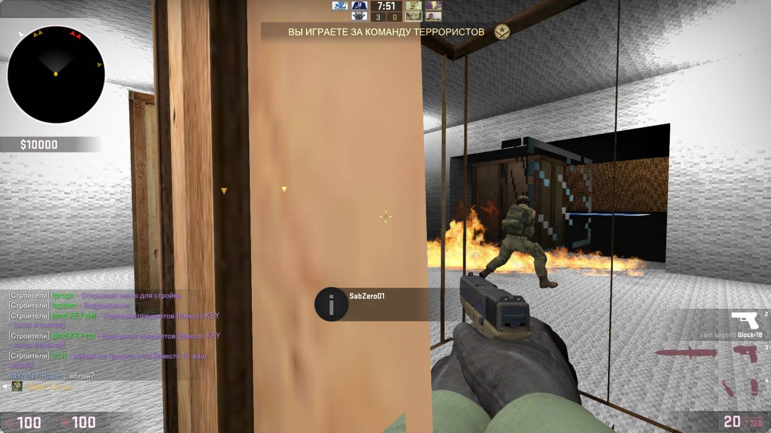 | 1) Binni_Pyx2) Стим айди не успел узнать, знаю только ссылку профиля: http://steamcommunity.com/profiles/76561198114108263/ 3) 22.06.14, а со временем ~15:25 4) Как согрешил игрок: В общем, он застроил респавнт Террористов. Потом, после окончания времени строительства, он начал шмалять по тем, кто стоял внутри спавна и многих убил. Так же у него не было прохода вы нычку. Я особо не хотел сюдя писать, но т.к. он убил много людей таким способом, накатайте ему бан, ну или предупреждение. 5) Демка, скрин (прочая доказательная база только приветствуется):http://rghost.ru/56514724, http://rghost.ru/56514739