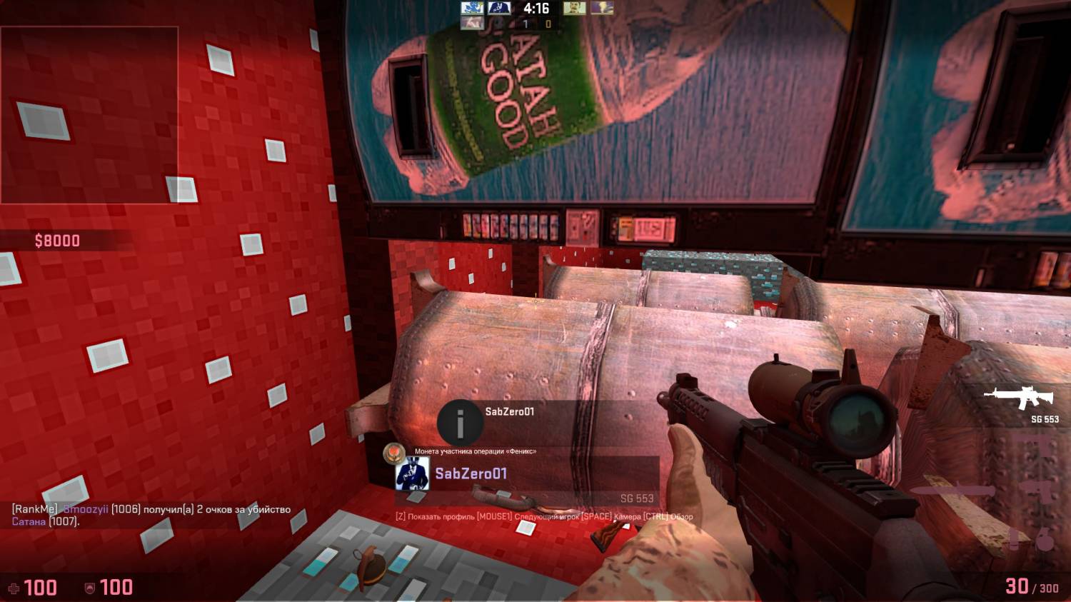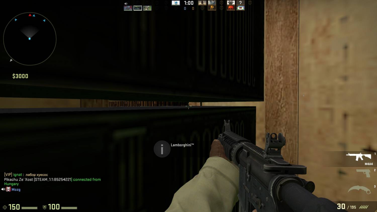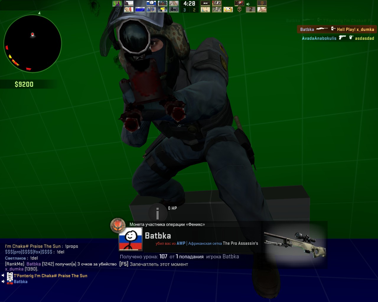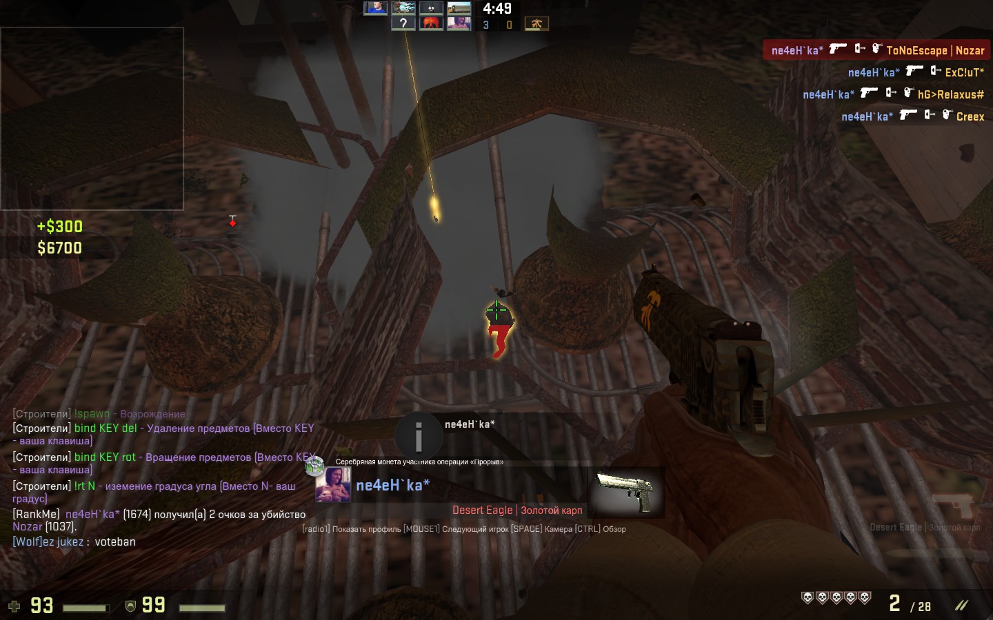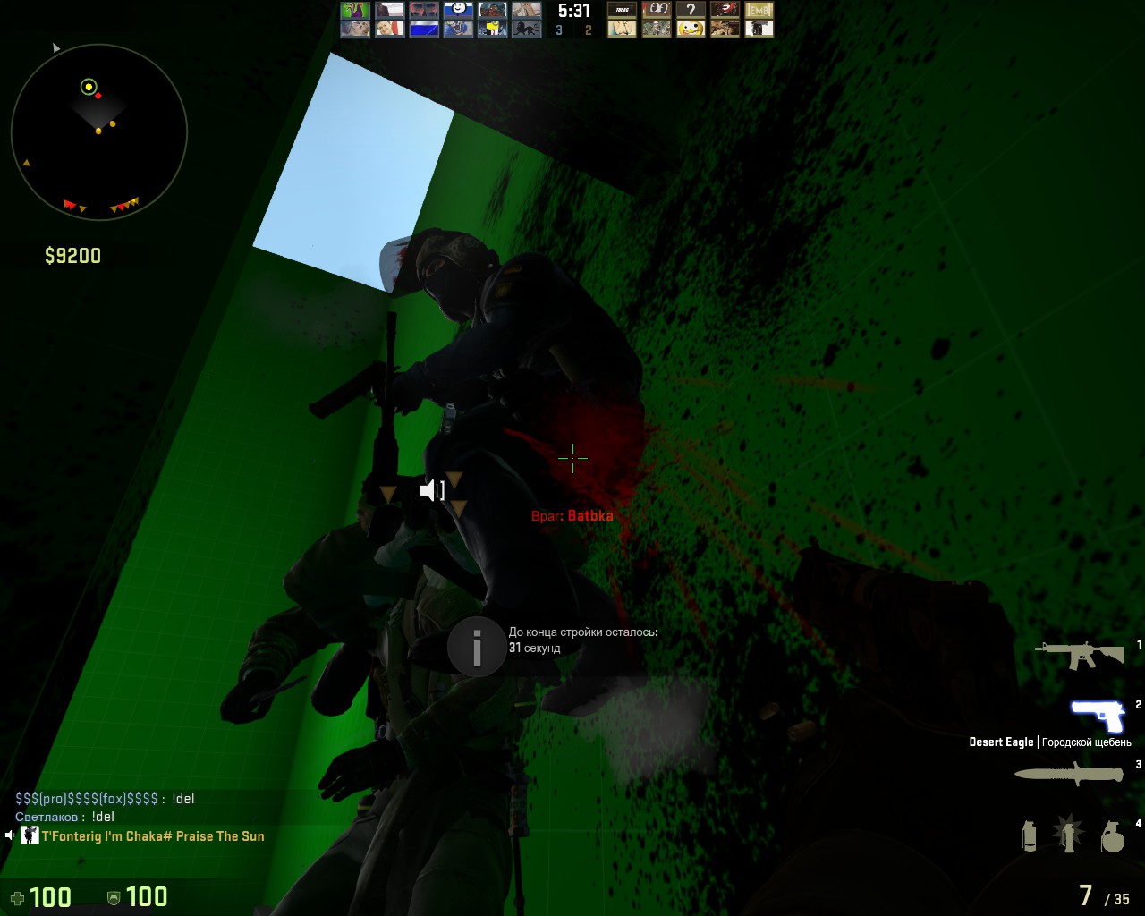| 1) Binni_Pyx2) Стим айди не успел узнать, знаю только ссылку профиля: http://steamcommunity.com/profiles/76561198114108263/ 3) 22.06.14, а со временем ~15:25 4) Как согрешил игрок: В общем, он застроил респавнт Террористов. Потом, после окончания времени строительства, он начал шмалять по тем, кто стоял внутри спавна и многих убил. Так же у него не было прохода вы нычку. Я особо не хотел сюдя писать, но т.к. он убил много людей таким способом, накатайте ему бан, ну или предупреждение. 5) Демка, скрин (прочая доказательная база только приветствуется):http://rghost.ru/56514724, http://rghost.ru/56514739