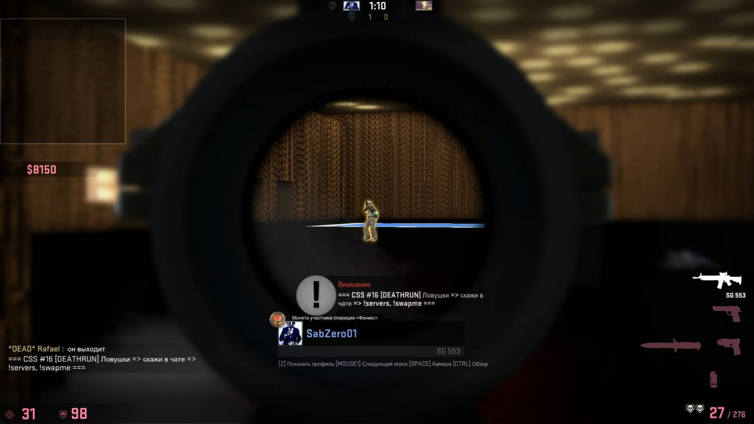 | 1) SabZero012) STEAM_1:1:87462295 3) 23:00 08.07.2014 4)Играя за кт, построил нычку в оружейке(+ оскорбление и оскорбление родных и близких (на это нету скринов)) 5)