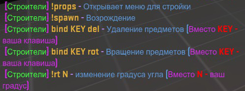 | Новости за 14.03.2015 Изменен таймер по центру экрана. (Теперь при наведение на чей-либо предмет, можно увидеть его никнейм вместе таймером) Добавлена функция Knife Fight 1x1 Добавлена новая карта props_rlx_asphalt_v6 Убрали предмет - Барьер Добавлены команды !rules (просмотр правил), !donat (просмотр ВИП-прав), !faq (Часто задаваемые вопросы по Пропсу), !bans (баны сервера).