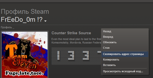 | ПЕЧЕНЬКА, так же ссылку на стим профиль можно получить нажав лишь ПКМ и потом выбрать "Скопировать адресс страницы"(находясь на своей странице) вот пример: