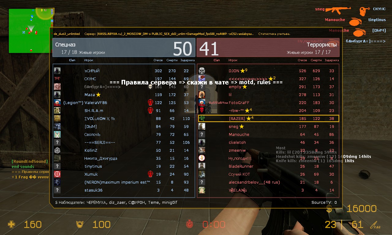| Объясняю почему молчали: потому что не было командных очков: игра шла до 333 личных побед, и сколько там у команды было неважно.По крайней мере для подавляющего большинства. Вы же сами изменили смысл игры, и уменьшение времени сказалось сразу и заметно всем, кто играет за кт. Слава хочет выровнять игру, но получается, что никто из сильных игроков на кт играть не хочет: не буду приводить примеры, как я сегодня перекидывал некоторых за кт, и они с упорством, достойным лучшего применения, переходили всеми правдами и неправдами обратно за т. Вот и результат. Я тоже не просто так пишу про время, и про то, что его просто не остается при постановке бомбы - заходите и смотрите сами, насколько игра неровная и истеричная стала.