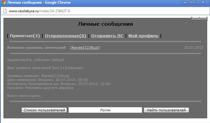 | Gregory_House, тут другая ситуация, просто у Женечки не выдержала попка, вот этот тип 1ый под руку и попался. Флуда то не было. Good_Worm, это да, сначала должно следовать предупреждение в виде лампочки или +- репы :3