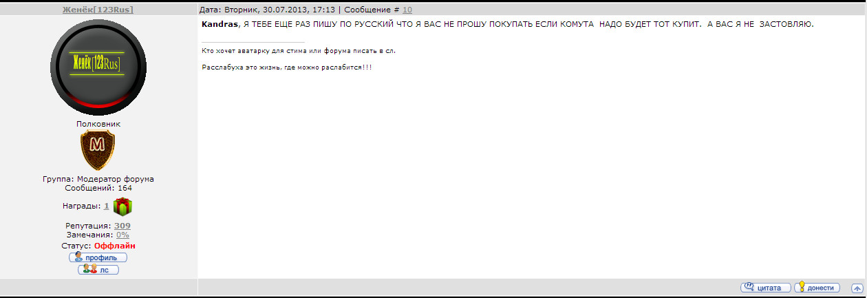 | Цитата (Chackfire) Как это понять? Кто автор темы? Какую тему обосрали? Что? Кто кому отомстил? Женек автор темы, про продажи стим, а эту тему обосрало пол ресурса, вот он тебе и отомстилЦитата (FrAeRock) Я считаю что он вполне имел право дать замечание в одобренной Vampiro теме , ибо человек указал другой ресурс , тем самым перенаправил покупателей туда Да я понимаю что замечание он мог дать, но как сказал Цитата (Kandras) просто у Женечки не выдержала попка Он мог и просто написать в личку, ведь это не совсем реклама.