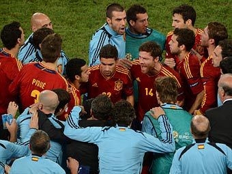 | Сборная Испании вышла в финал Евро-2012 Сборная Испании по футболу стала первым финалистом чемпионата Европы 2012 года по футболу. Основное и дополнительное время полуфинального матча испанцев с командой Португалии закончилось вничью (0:0), а в серии послематчевых пенальти испанцы победили со счетом 4:2. Первые удары в серии пенальти получились неудачными у представителей обеих команд. Удар испанца Хаби Алонсо отбил вратарь сборной Португалии Руй Патрисиу, а затем успешно сыграл голкипер испанцев Икер Касильяс, отразивший пенальти в исполнении Жоау Моутинью. Затем у испанцев свои попытки реализовали Андрес Иньеста и Херард Пике, а у португальцев пенальти забили Пепе и Нани. Четвертый удар у сборной Испании исполнил Серхио Рамос, и оказался точен. А защитник питерского "Зенита" Бруну Алвеш, который бил четвертым у португальцев, попал в перекладину. Решающий пенальти у сборной Испании удачно исполнил Сеск Фабрегас. Прежде сборная Португалии никогда не проигрывала на крупных турнирах в серии пенальти. Португальцы били послематчевые пенальти дважды, и оба раза обыграли англичан (на Евро-2004 и на ЧМ-2006). Сборная Испании, выйдя в финал Евро-2012, повторила достижение сборной ФРГ, которая в 1970-е годы становилась финалистом трех крупных турниров подряд (Евро-1972, ЧМ-1974 и Евро-1976). В финале Евро-2012 соперником испанцев будет команда Германии или Италии. Полуфинал с участием этих команд пройдет 28 июня. Финальный матч турнира состоится 1 июля.