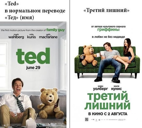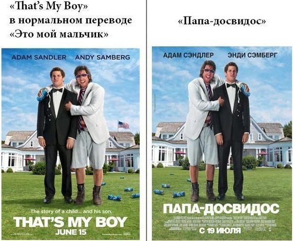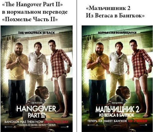 | Ну они не от балды переводят а производят адаптацию под людей. Кто пойдёт на фильм похмелье? а вот мальчишник звучит уже интересней)