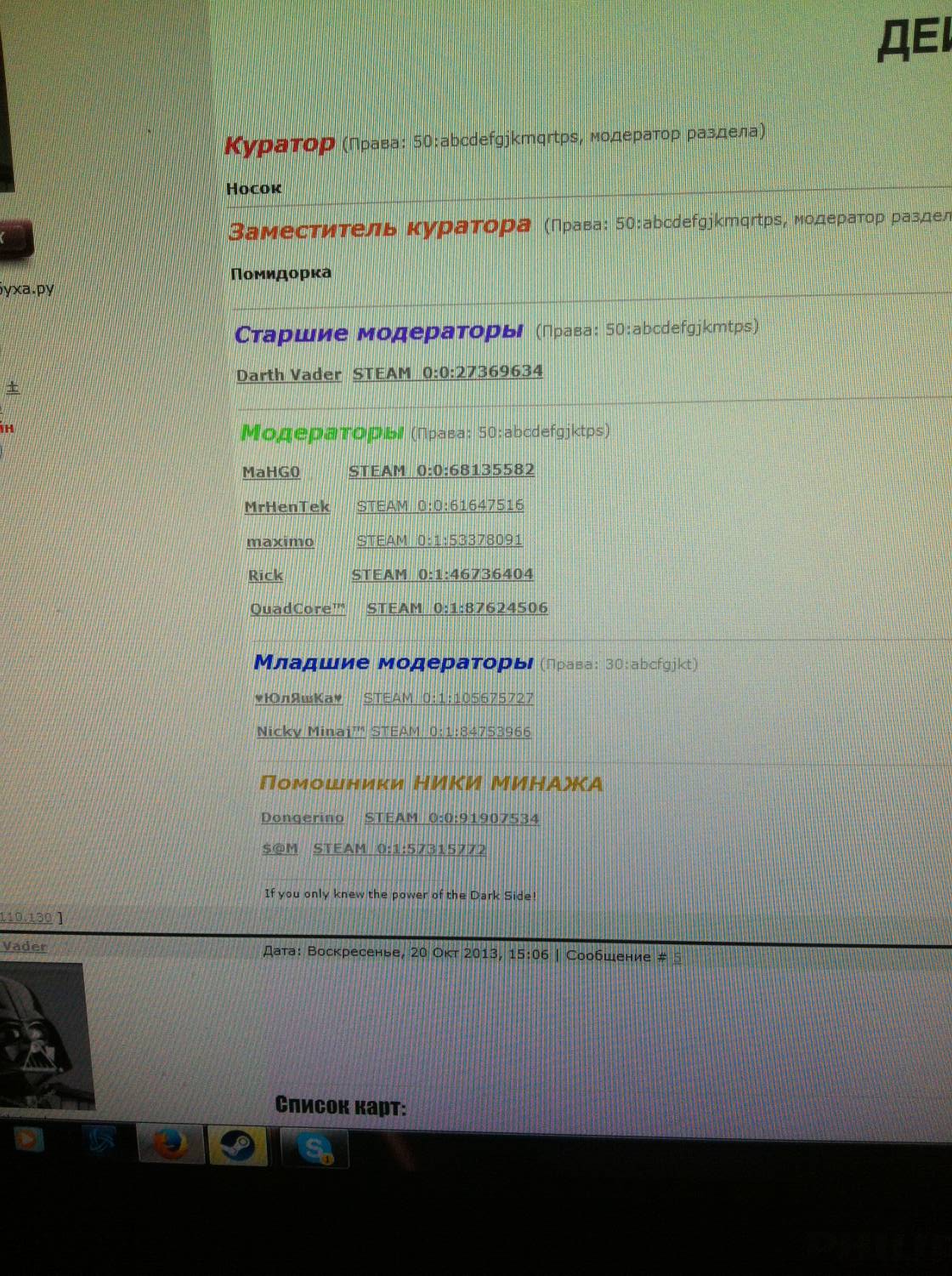 | Дорогой джаил.Я хочу сделать обращению к мл.модератору.(Nicky Minaj™ STEAM_0:1:84753966).Если тебе ДАЛИ ПРАВА то используй их ПО НАЗНАЧЕНИЮ.Какого ХРЕНА ты мутишь просто так?Какого ХРЕНА ты банишь просто так?Какого ХРЕНА ты кикаешь просто так?Если ты скажешь что я лгу,то в бой пойдут пруфы,но их я кидать не собираюсь,т.к. я не подлая крыса,но все же.Теперь я могу с уверенностью сказать,что $@M не просто так тебя понизил,а по объективным причинам.И да если тебе нужно самоутвердиться то подойди к зеркалу и поговори сам с собой,но явно это показывать на джаиле не надо.И да если хочешь быть кем-то на джаиле то иди на роль помощник сервера и предлагай карты,а в админах тебя я видеть не желаю.И да не оскорбляй меня НА ФОРУМЕ это так на будущее... p.s. ДАВАЙ ПИШИ НЕ БОМБИ ДОНГ НЕ БОМБИ.Я ПРЯМ ЖДУ НАФИГ...(Ибо нефиг фигню в лс писать,я не бомблю просто я хочу иметь АДЕКВАТНОЕ РУКОВОДСТВО ДЖАИЛА,а это сделать сложно было,но слава богу $@M хоть справляется.Я просто был сcаным сыкуном.) Это пока на завтрак вам.