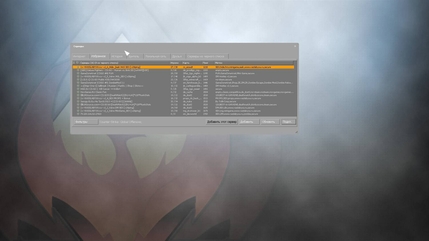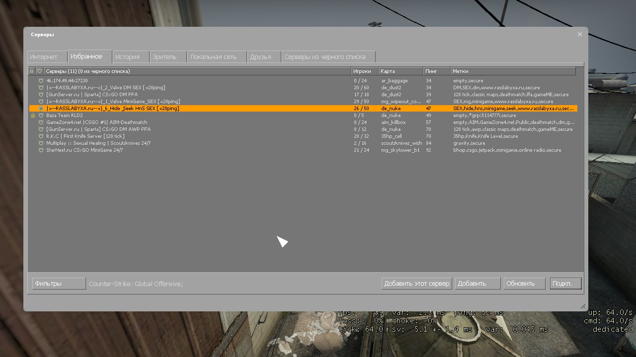 | Надеюсь, что будит постоянный онлаен, желаю удачи серверу |>--RASSLABYXA.ru--<|_6_Hide & Seek HnS SEX [<20ping] , и до тех пор пока я там модератор, онлаен будит постоянный :))